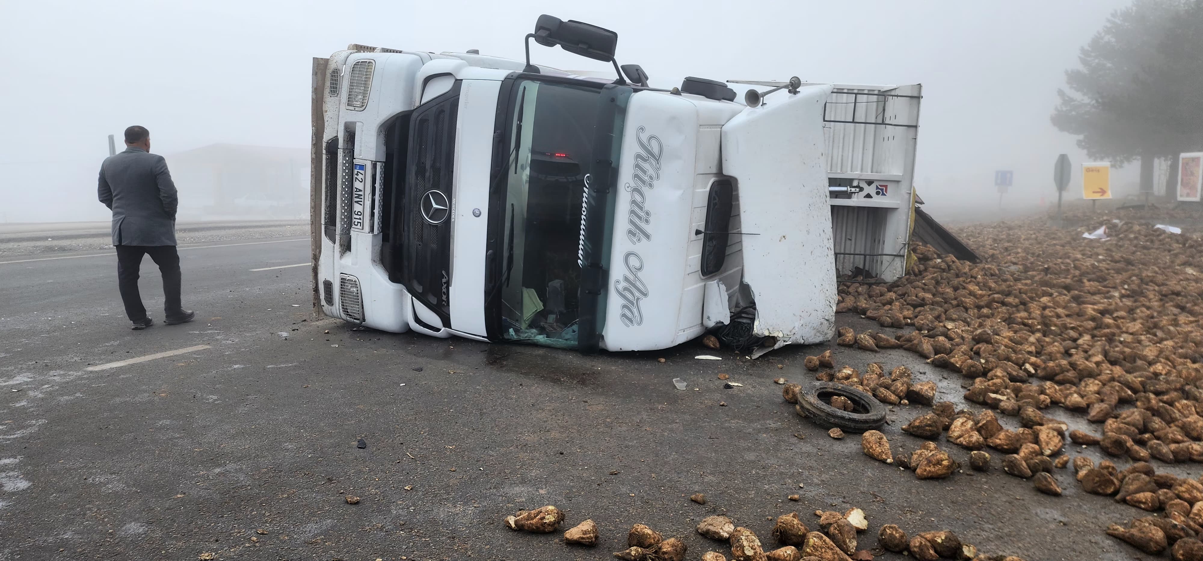 Tırın devrilmesi nedeniyle dorsede bulunan pancarlar yola savruldu.