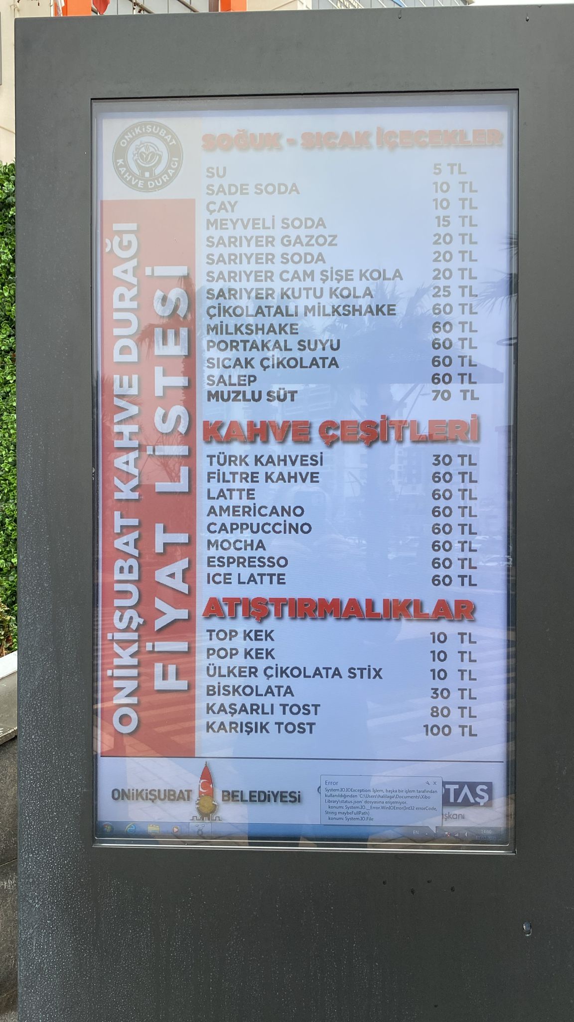 Kahve Durağı, zengin menüsü ve bütçe dostu fiyatlarıyla vatandaşlara ekonomik ve kaliteli bir kafe deneyimi sunuyor. Mekânda sunulan bazı ürünler ve fiyatları örnek gösterilirse, su 5, türk kahvesi 30, çay 10, salep 60, milkshake 60, filtre kahve 60 ve tost 80 TL’den satışa sunuluyor.