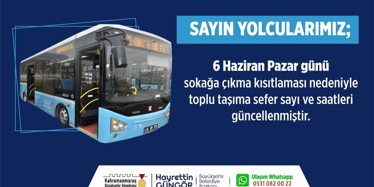 Kahramanmaraş Büyükşehir Belediyesi tarafından 6 Haziran Pazar günü sokağa çıkma kısıtlaması nedeniyle toplu taşıma sefer sayı ve saatlerinde güncelleme yapıldı.