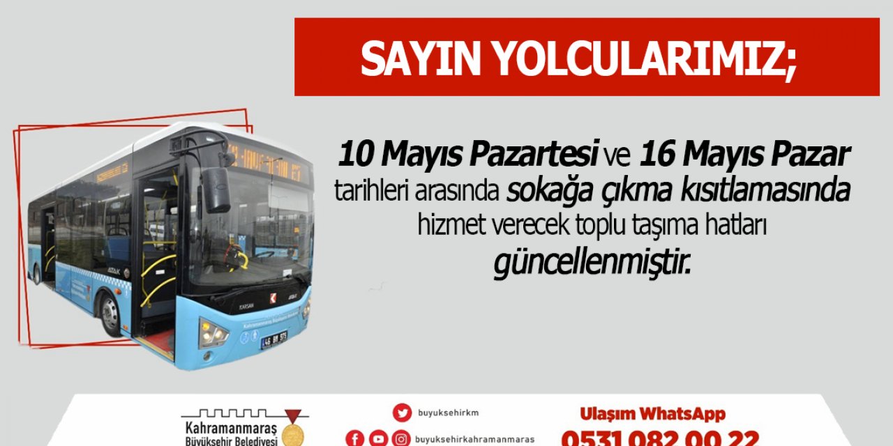 Kahramanmaraş Büyükşehir Belediyesi toplu taşıma araçlarının sefer sayı ve saatlerinde güncellemeye gitti. İçişleri Bakanlığı tarafından yayınlanan genelge kapsamında uygulanacak tam kapanma sürecinde toplu taşıma hatları 10 Mayıs Pazartesi ila 16 Mayıs Pazar tarihleri arasında da hizmet vermeyi sürdürecek. 10 Mayıs Pazartesi ila 12 Mayıs Çarşamba günü arası 3, 4, 7, 8, 10, 11, 12, 13, 15, 17, 18, 24, 28, 29, 30, 33, 34, 35, 44, 30/B, 32/B, 34/B, 36/B, 37, 60 ve 39 numaralı seferler ulaşım sağlayacak. Ramazan Bayramıyla birlikte ise 13 Mayıs Perşembe ila 16 Mayıs Pazar tarihleri arasında 3, 8, 13, 18, 24, 28, 29, 30, 32/B, 34/B, 34, 36/B, 37 ve 44 sefer numaralı hatlar hizmet verecek. Ulaşım Hizmetleri Dairesi Başkanlığı’ndan kısıtlılık süresince çalışan sefer saatlerine https://kahramanmaras.bel.tr/toplu-tasima-guzergah-ve-saatleri adresinden ulaşılabileceği veya 0531 082 00 22 numaralı “Ulaşım Whatsapp” hattı üzerinden bilgi alınabileceği ifade edildi.