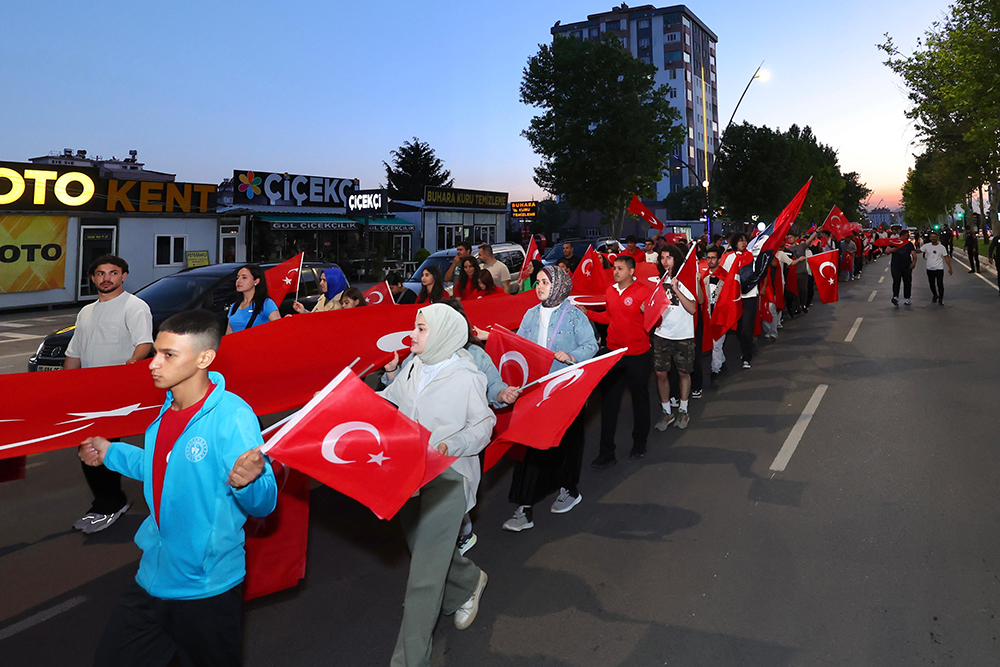 Onikişubat Parkı’ndan başlayarak Necip Fazıl Kısakürek Kültür Merkezi’ne kadar süren yürüyüşte, ellerinde Türk bayraklarıyla coşkulu kalabalık, marşlar eşliğinde adım adım ilerledi. Yürüyüşe; 66. Hükümet Tarım ve Orman Bakanı Prof. Dr. Vahit Kirişci, Vali MükerremÜnlüer, Büyükşehir Belediye Başkanı Fırat Görgel, KSÜ Rektörü Prof. Dr. Alptekin Yasım, AK Parti İl Başkanı Muhammed Burak Gül, Onikişubat Belediye Başkanı Hanifi Toptaş, İl Jandarma Komutanı Ali Gemalmaz ve İl Emniyet Müdürü Nurettin Gökduman da katıldı.