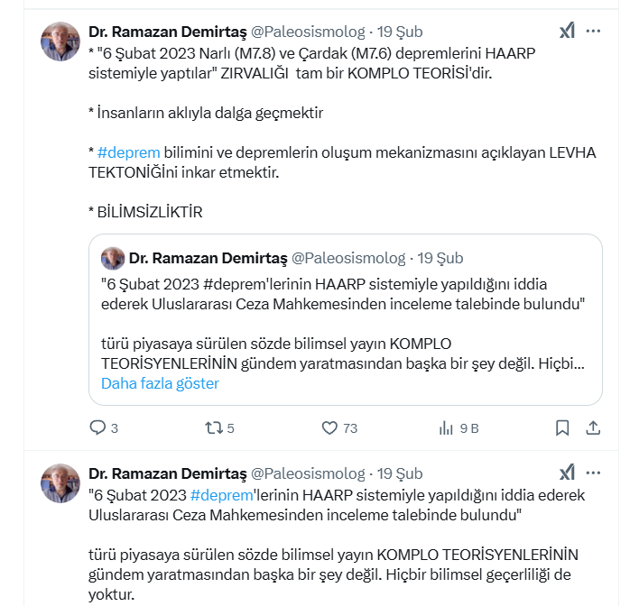“6 Şubat 2023 tarihinde meydana gelen Kahramanmaraş merkezli depremleri HAARP sistemiyle yapıldığına dair ortaya atılan iddialar, tam anlamıyla bir komplo teorisidir. Bu tür açıklamalar, bilimle ve gerçeklerle hiçbir şekilde örtüşmemektedir. Depremlerin oluşum mekanizmasını açıklayan Levha Tektoniğini inkar etmek ve insanların aklıyla dalga geçmekten başka bir şey değildir. Depremler, yer kabuğundaki levha hareketlerinin sonucu olarak meydana gelir ve bu doğal bir süreçtir.”