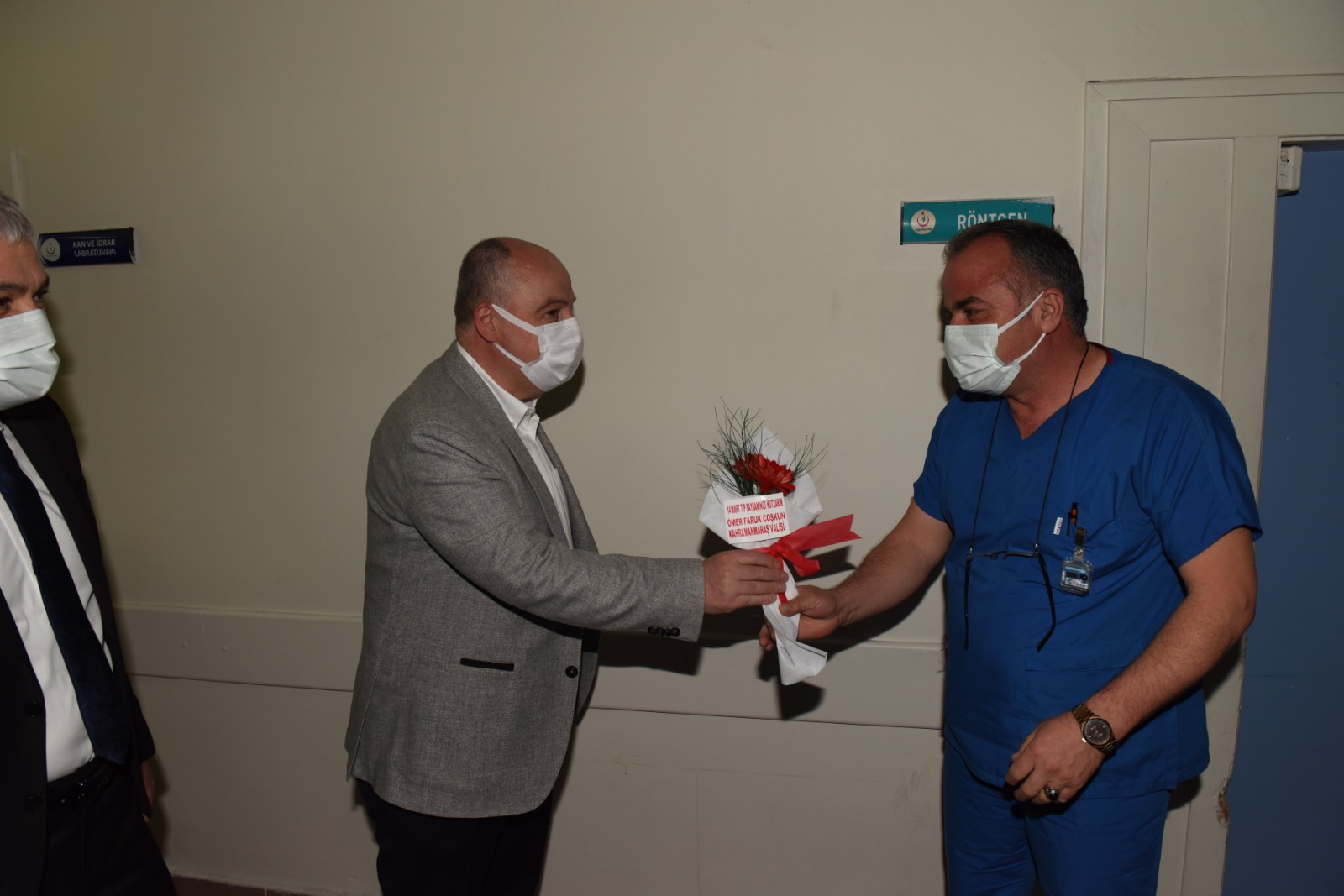 Koronavirüsle mücadelede gecesini gündüzüne katarak fedakârca çalışan hekimlerimize ve sağlık çalışanlarımıza sürpriz ziyarette bulunan Vali Coşkun, hekimlerimiz ve sağlık çalışanlarımıza çiçek dağıtarak, 14 Mart Tıp Bayramlarını kutladı.