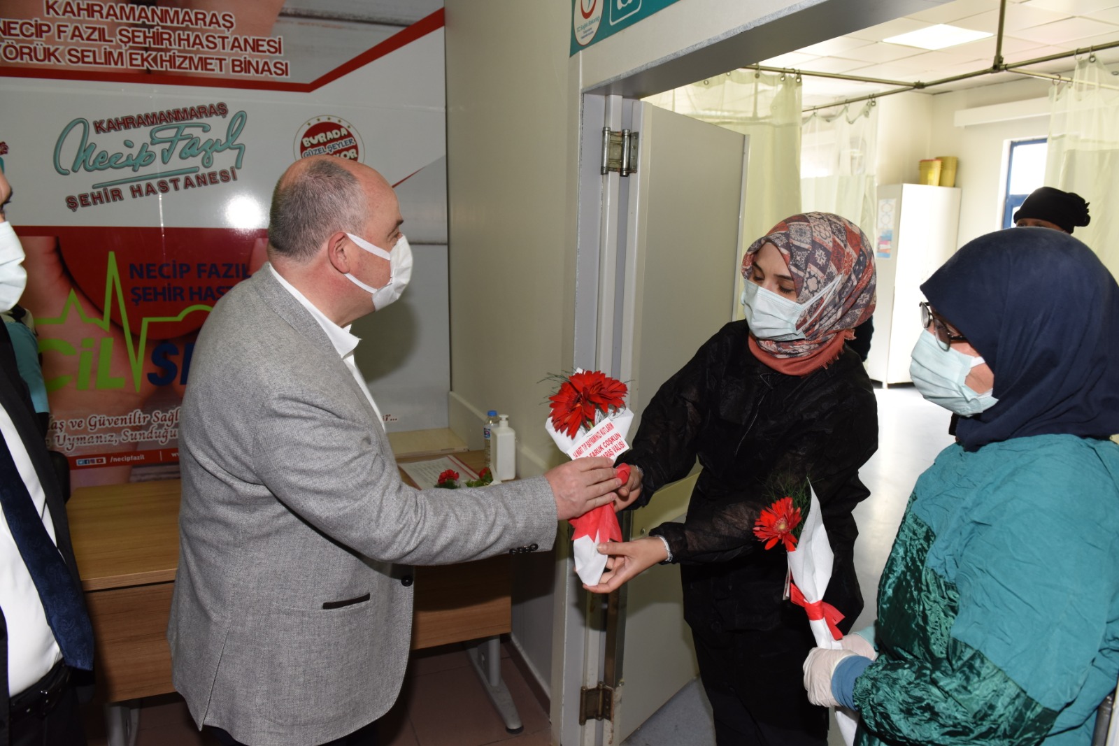 Kahramanmaraş Valisi Ömer Faruk Coşkun, kentte hizmet eden hekimleri ve sağlık çalışanlarını ziyaret etti. Vali Coşkun, ziyarette çalışanlara çiçek hediye etti.
