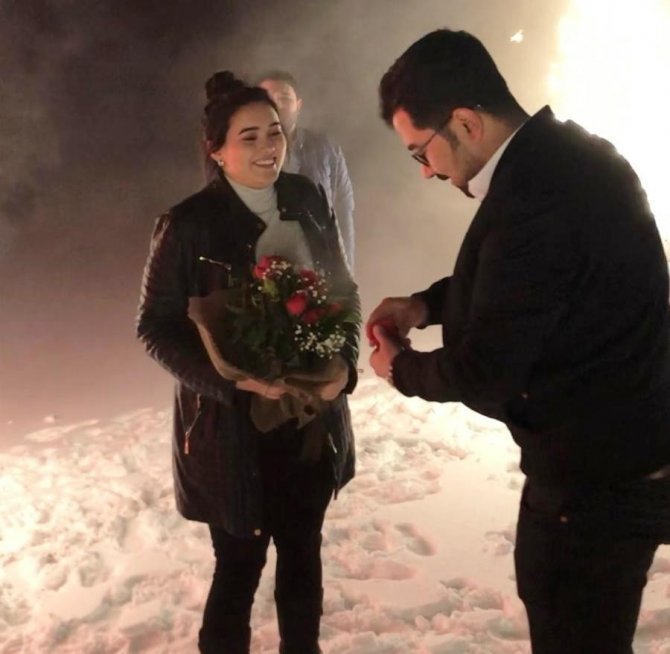 Kahramanmaraş'ta bir kişi, Ahir Dağı'nın karlı zirvesinde kız arkadaşına sürpriz evlilik teklifi yaptı.