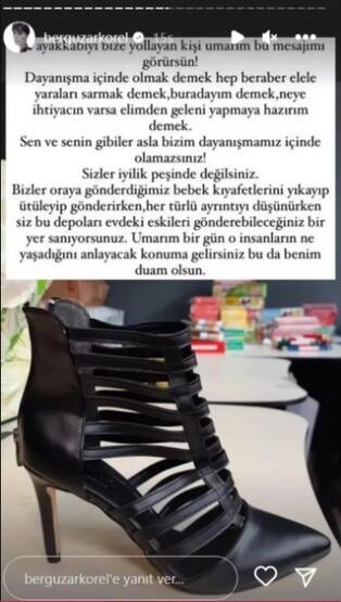 Ayakkabıyı bize yollayan kişi umarım bu mesajımı görürsün" diyen Bergüzar Korel paylaşımında şunları yazdı: "Dayanışma içinde olmak demek hep beraber el ele yaraları sarmak demek, buradayım demek, neye ihtiyacın varsa elimden geleni yapmaya hazırım demek".