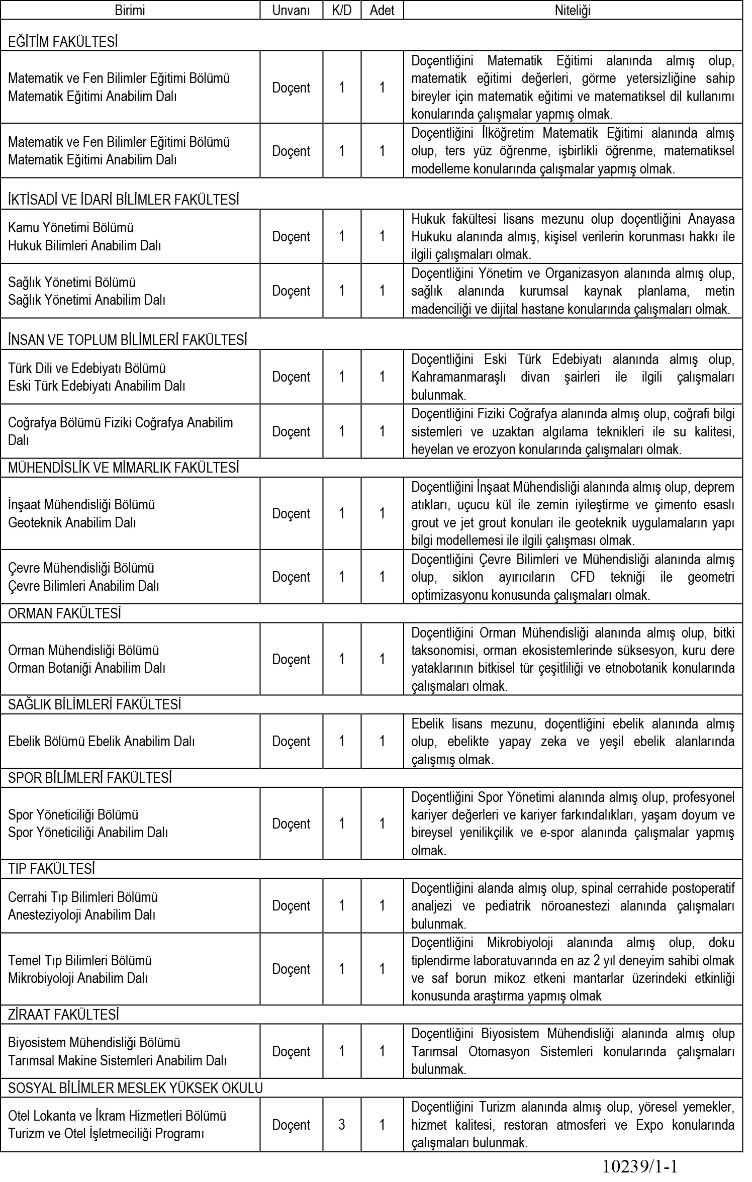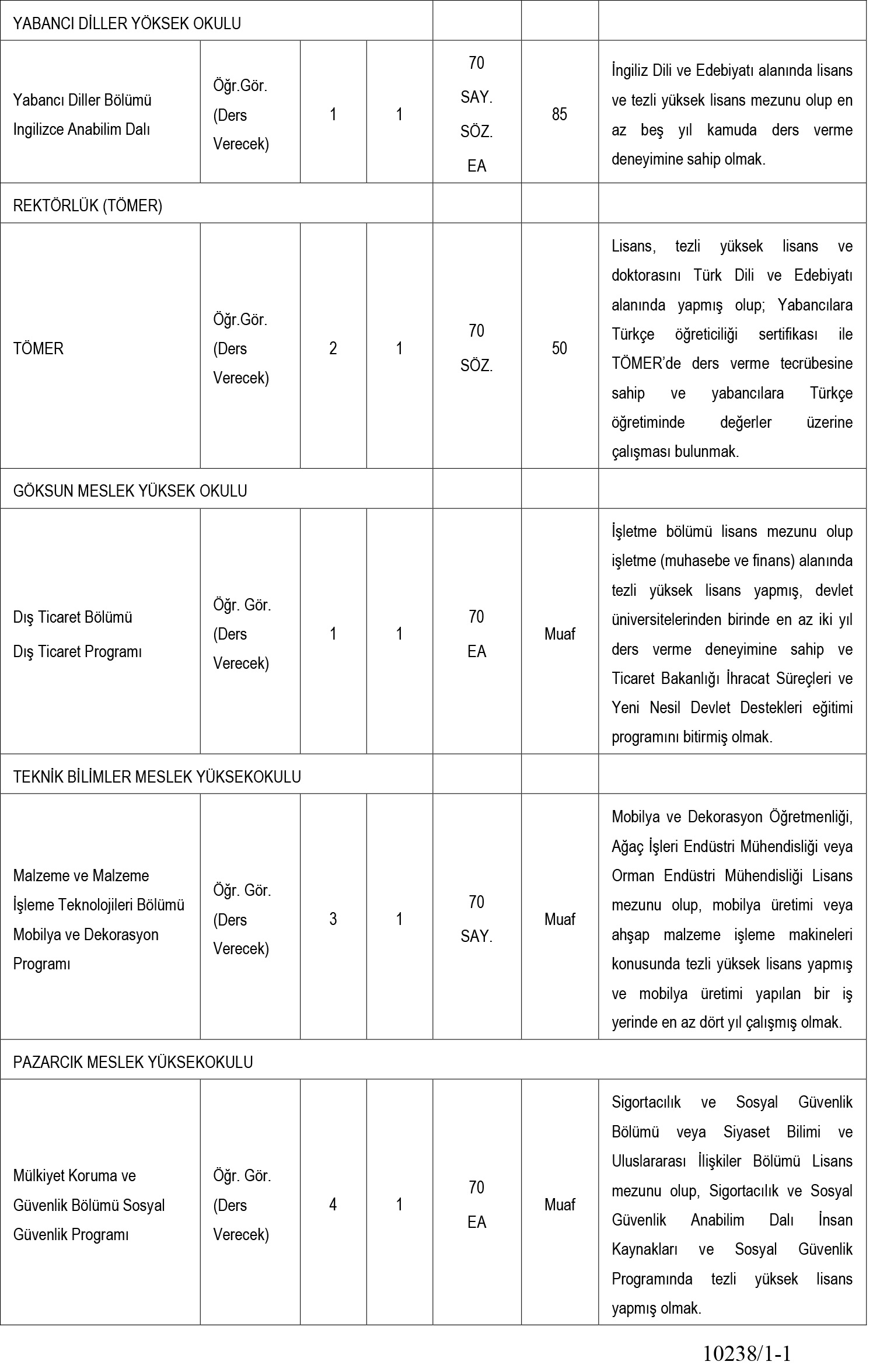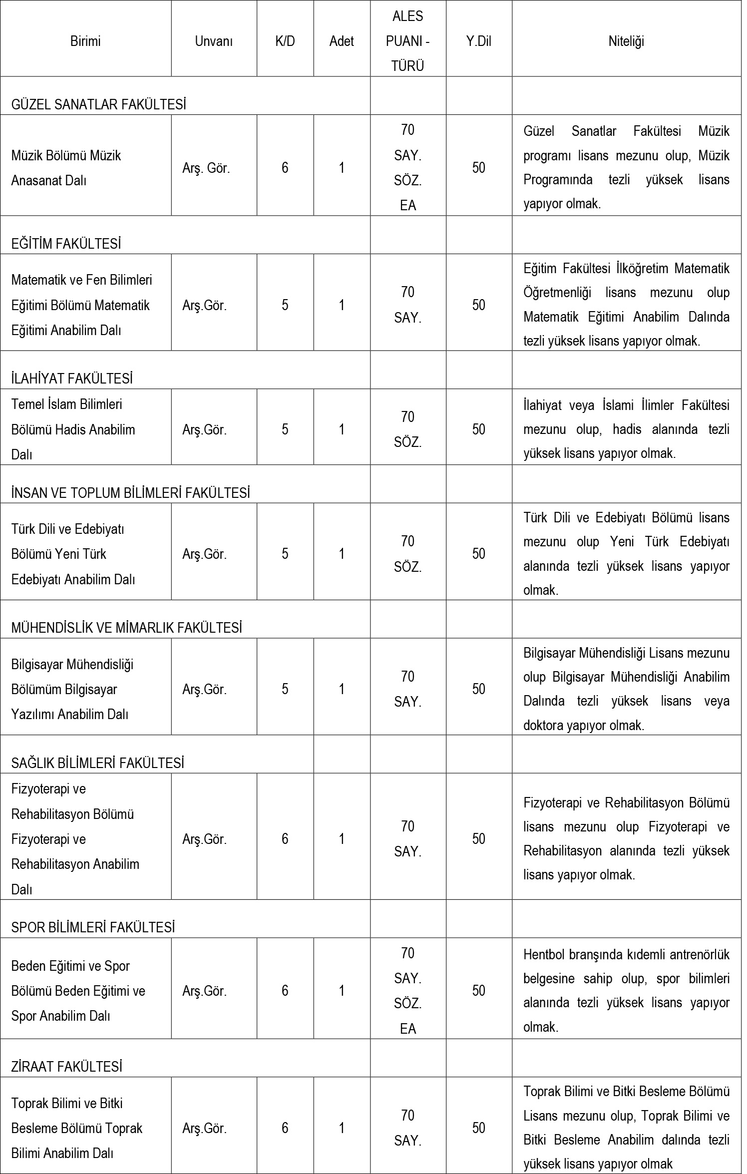 Özel Şartlar: Araştırma görevlileri için 35 yaşını doldurmamış ve lisansüstü eğitimine devam eden adaylar tercih edilecektir. Öğretim üyeliği başvurularında tezli yüksek lisans şartı bulunurken, doçentlik için en az 60 yabancı dil puanı gerekmektedir.