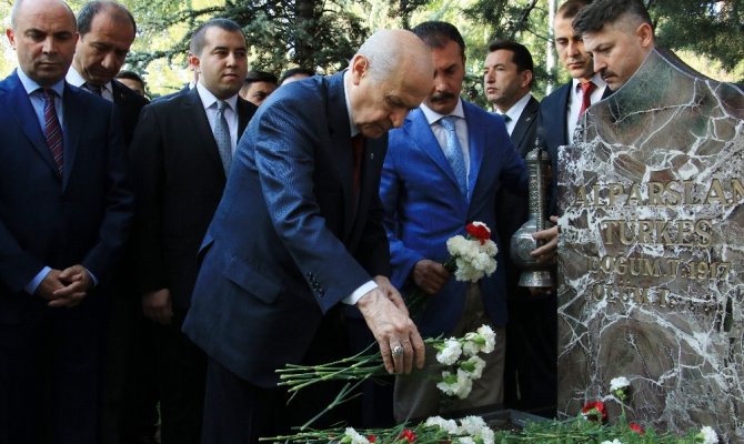 MHP Genel Başkanı Bahçeli, bayram namazının ardından merhum Alparslan Türkeş'in Beştepe'deki mezarını ziyaret etti. Burada kendisini bekleyen partililerle tek tek bayramlaşan Bahçeli, daha sonra Türkeş'in kabrine geçti. Bahçeli, Türkeş'in kabrine kırmızı ve beyaz karanfiller bıraktı ve bakır ibrikle mezara su döktü. Mezarın başında nöbet tutanların bulunduğu kulübede bir süre oturan Bahçeli, buradan ayrılırken basın mensuplarına açıklamalarda bulundu. Tüm İslam alemi camiasının Kurban Bayramı'nı idrak ettiğini belirten Bahçeli, Türk milleti olarak da böyle bir bayramı coşkuyla kutlama arzusu taşıdıklarını ancak İslam camiası ile Türkiye'nin önemli sıkıntılar ve hüzünler yaşadığını kaydetti. Bahçeli, önümüzdeki günlerin Türkiye ve İslam alemi için çok daha güzel olacağını söyledi.