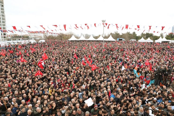 İstanbul'da yapılan mega projeleri hatırlatan Erdoğan, "Bunları biz yaptık bay Kemal. Onların hayalleri ulaşamaz ama biz yaptık. Bizden önce boğazın üzerinde iki köprü vardı. Üçüncüyü yaptık. Dedik ki yetmez. Bir de İstanbul'u İzmir'e bağlayalım. Osmangazi köprüsünü de orada yaptık. Onlar konuşur biz yaparız. Farkımız bu. Bu şehirde üretilen her değer, dalga dalga tüm şehirlerimizi, bölgemizi ve dünyayı etkiliyor. Yabancı liderler geliyor. Onlara "bak denizin altından raylı sistem geçiyor, bak buradan Avrasya tüneli arabalar geçiyor" diyoruz. Şaşırıyorlar. "Ben on sene önce geldiğimde bunlar yoktu" diyorlar. Bunlar son 15 seneye sığmış olan eserlerimiz" şeklinde konuştu.