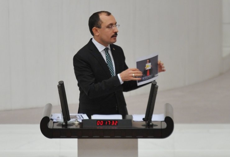 "Bugün size arkasında Kandil'in olduğu kirli bir ittifak pazarlığını anlatmak istiyorum" diyen Muş, "Biliyorsunuz geçtiğimiz Kasım ayında CHP Genel Başkanı Kılıçdaroğlu bir Almanya seyahati yaptı. Burada Sevim Dağdelen isimli Alman Federal milletvekilinin başını çektiği bir milletvekili heyeti ile görüştü. Peki kimdir bu Sevim Dağdelen? Almanya Federal Meclisinde bakınız PYD bayrağını açan bir milletvekilidir" diyerek o fotoğrafı gösterdi.
