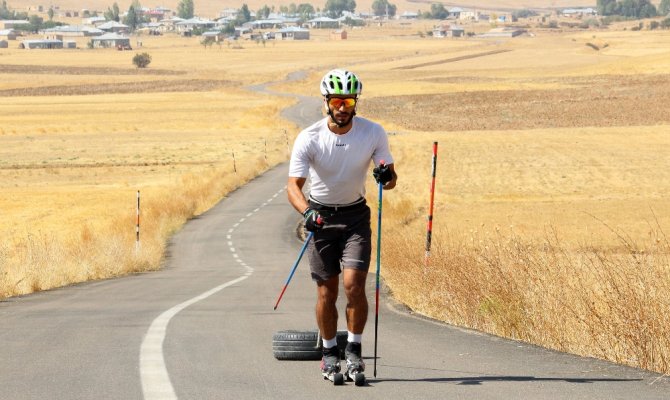Milli kayakçı Ömer Ayçiçek, Dünya Kayak Şampiyonasında Türkiye'yi en iyi şekilde temsil etmek için araba lastiğine geçirdiği halatı beline bağlayarak çalışmalarını asfaltta sürdürüyor.