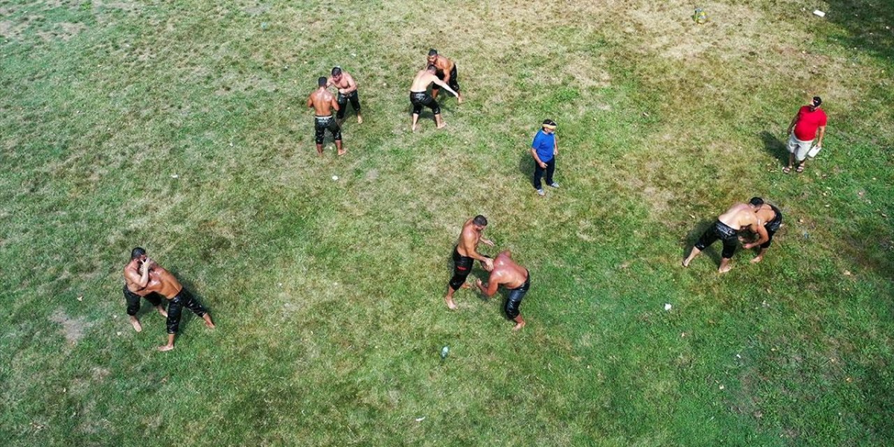 Kispetlerini giyen pehlivanlar, paça bağlayıp yağlandıktan sonra antrenörleri eşliğinde taktik ve güç antrenmanı gerçekleştirdi.
