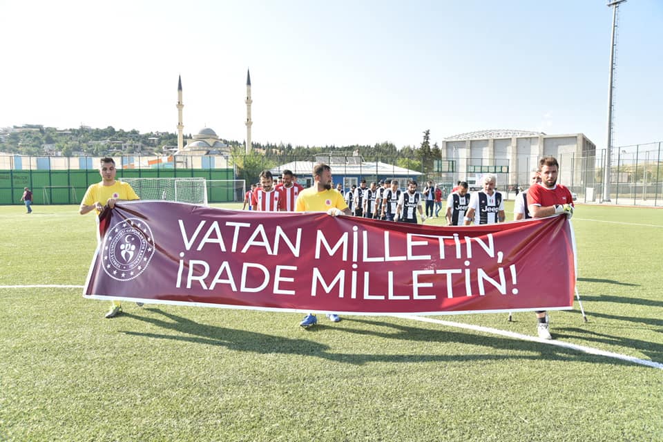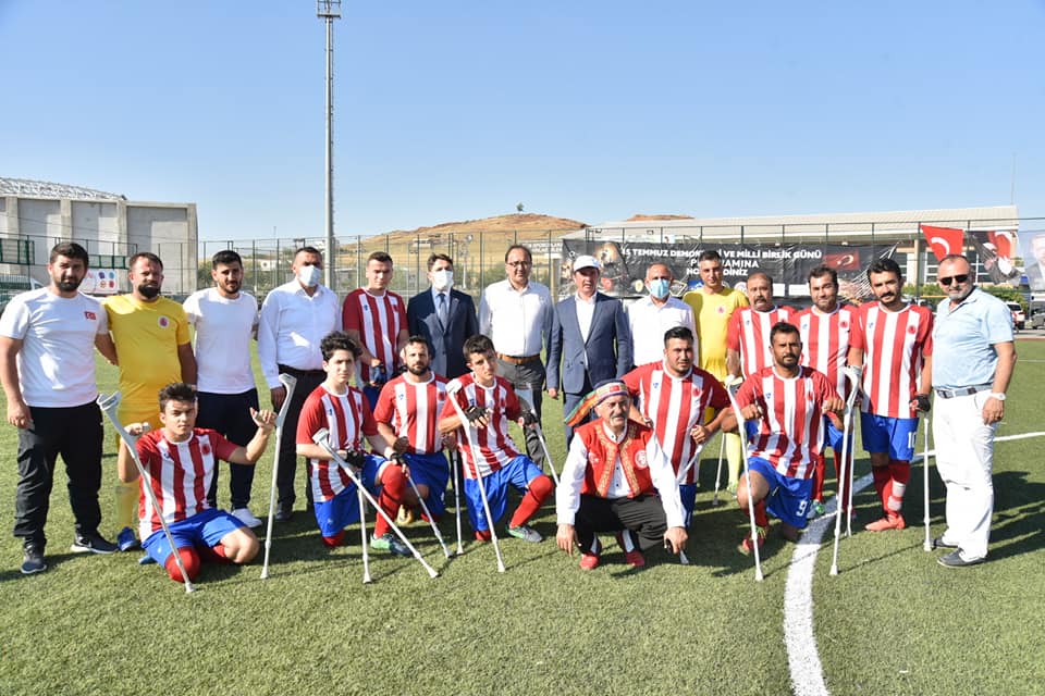 Vali Yardımcısı Kaymakam Vekili Mahmut Hersanlıoğlu, Türkoğlu Belediye Başkanı Osman Okumuş, Kahramanmaraş Amatör Spor Kulüpleri Federasyonu (ASKF) Başkanı Ekrem Karaoğlan ve Kurum Amirleri, 15 Temmuz Demokrasi ve Milli Birlik Günü anısına düzenlenen Suriye Afrin Ampute Futbol Takımı ile Türkoğlu Belediyesi Ampute Futbol Takımı arasında oynanan müsabakayı tribünden izledi.
