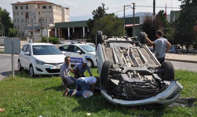 Bursa Ankara yolu üzerinde meydana gelen trafik kazasında kontrolden çıkan otomobil bariyerlere çarparak takla attı.