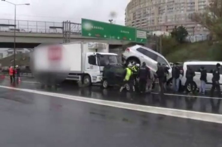 TEM Otoyolu Metris mevki'inde 7 araç birbirine girdi. Araçlardan biri diğer aracın üzerinde adeta şaha kalktı.