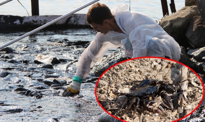 Kirlilikten deniz canlıları da zarar görürken, ham petrole bulanmış yengecin görüntüleri yürek sızlattı.