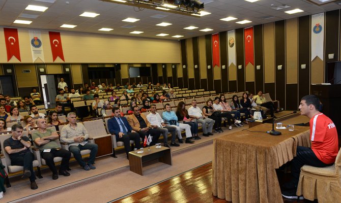 Kahramanmaraş Sütçü İmam Üniversitesi (KSÜ) Beden Eğitimi ve Spor Yüksekokulu (BESYO) Müdürlüğü ve Kahramanmaraş Büyükşehir Belediyesi Engelliler Şube Müdürlüğü işbirliği ile gerçekleştirilen söyleşi kapsamında Bedensel Engelliler Dünya Yüzme Şampiyonu Beytullah Eroğlu, KSÜ öğrencileri ile bir araya geldi.